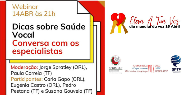 No âmbito do Dia Mundial da Voz, celebrado a 16 de abril, a Sociedade Portuguesa de Otorrinolaringologia e Cirurgia de Cabeça e Pescoço (SPORL-CCP) juntamente com a Sociedade Portuguesa de Terapia da Fala (SPTF), vão promover um webinar sobre Saúde vocal, no próximo dia 14 de abril, pelas 21h00.